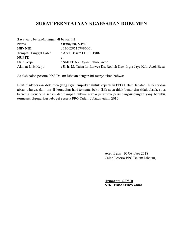 Surat pernyataan keabsahan dan kebenaran dokumen yang bertanda tangan dibawah ini : Sebenarnya sangat mudah untuk membuat disini kami menyediakan contoh surat pernyataan kehilangan dokumen berbentuk file.doc dan tinggal di edit sesuai dengan kebutuhan anda sendiri. Semua pernyataan dan data yang terlampir dan tercantum pada dokumen. Demikian contoh format surat pernyataan keabsahan dokumen (ppg/ ppgj) dalam jabatan tahun 2019 yang dapat saya bagikan, smeoga bermanfaat. Demikian contoh format surat pernyataan keabsahan dokumen (ppg/ ppgj) dalam jabatan tahun 2019 yang dapat saya bagikan, smeoga bermanfaat.